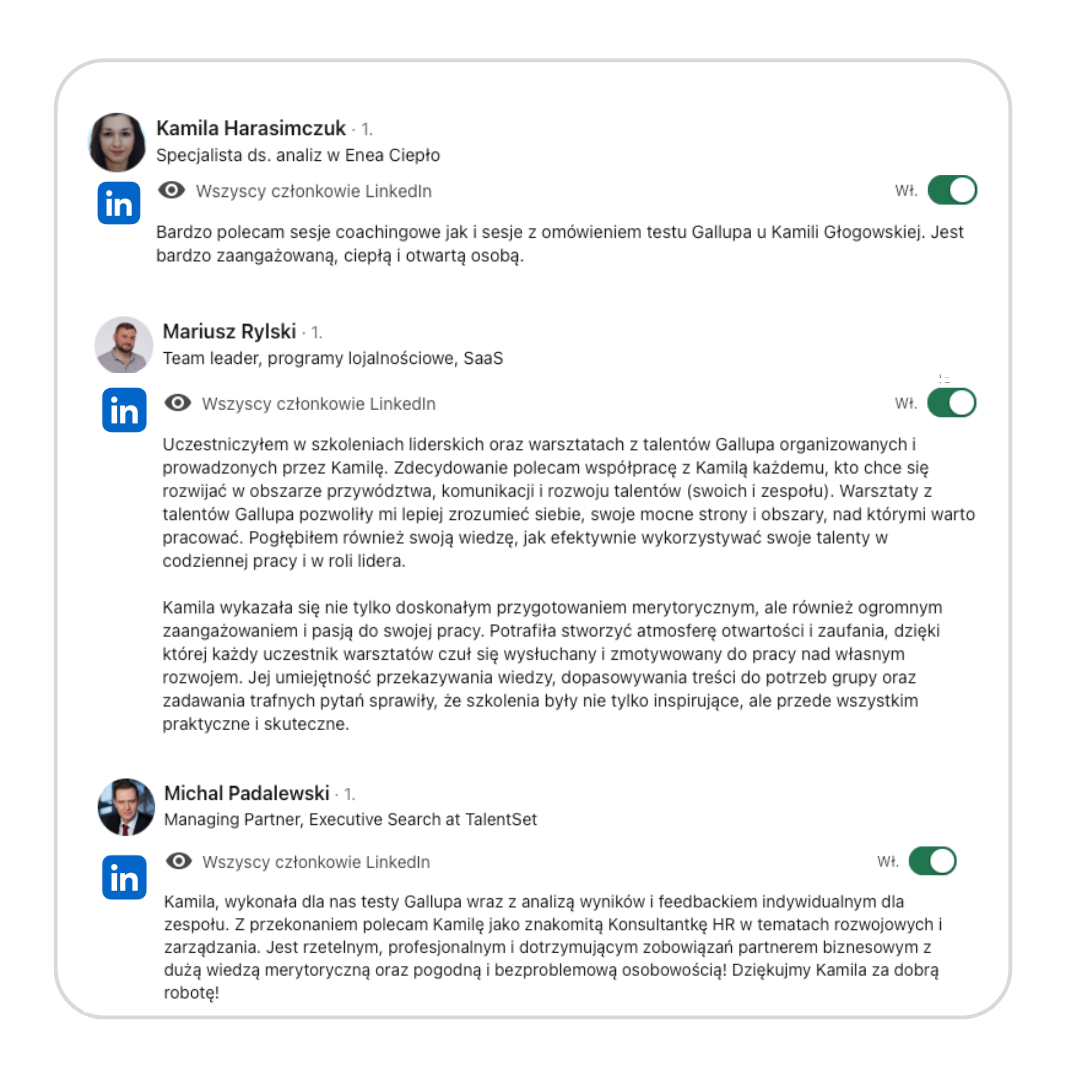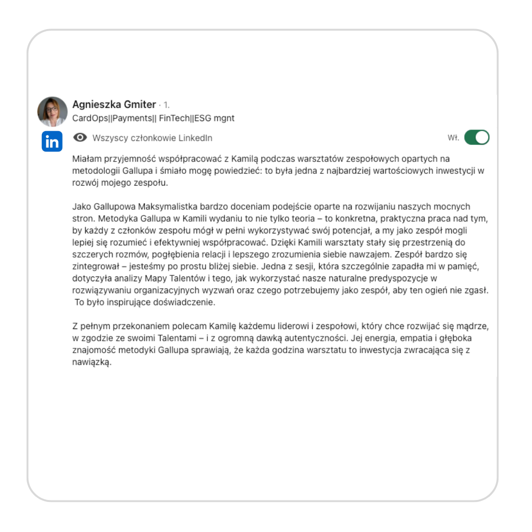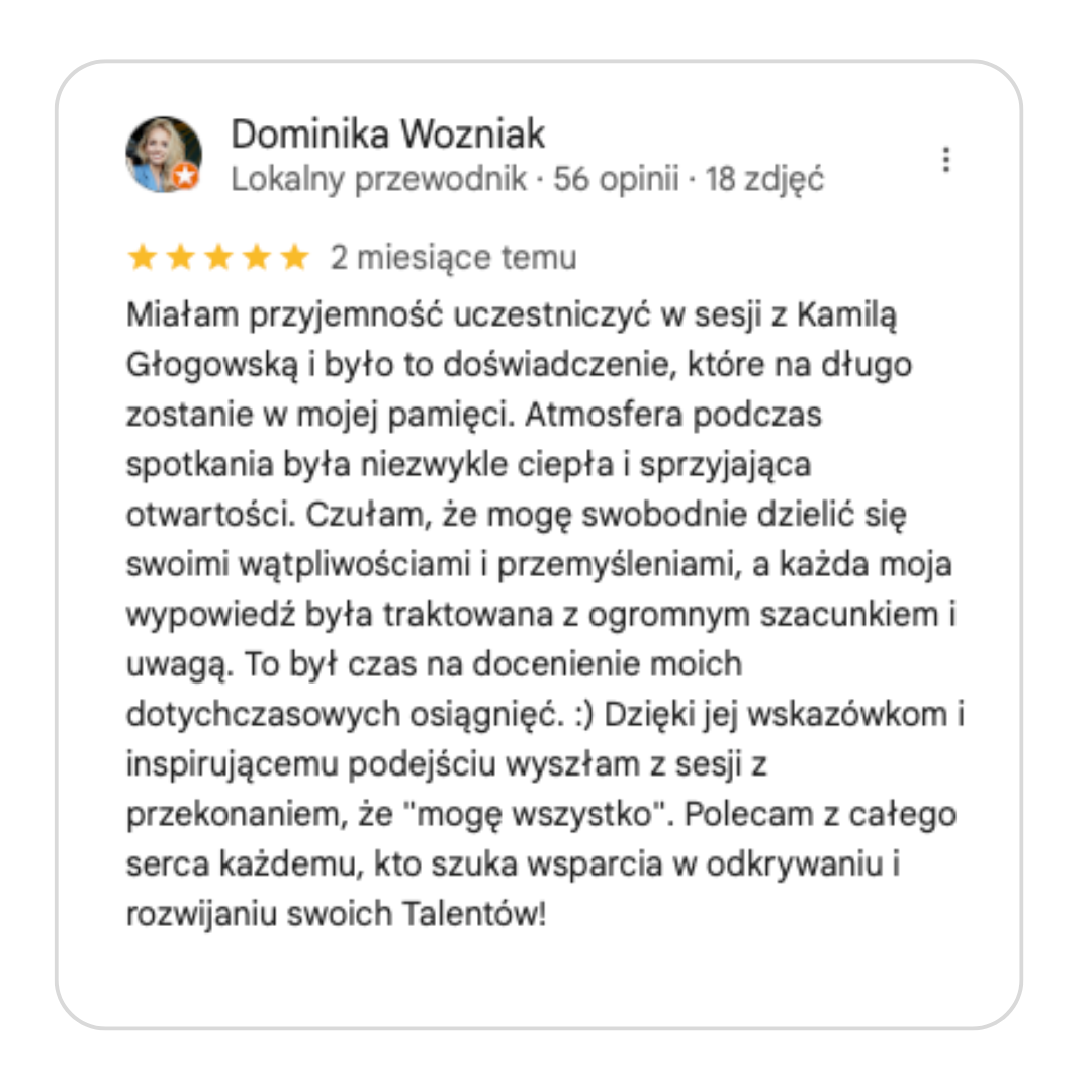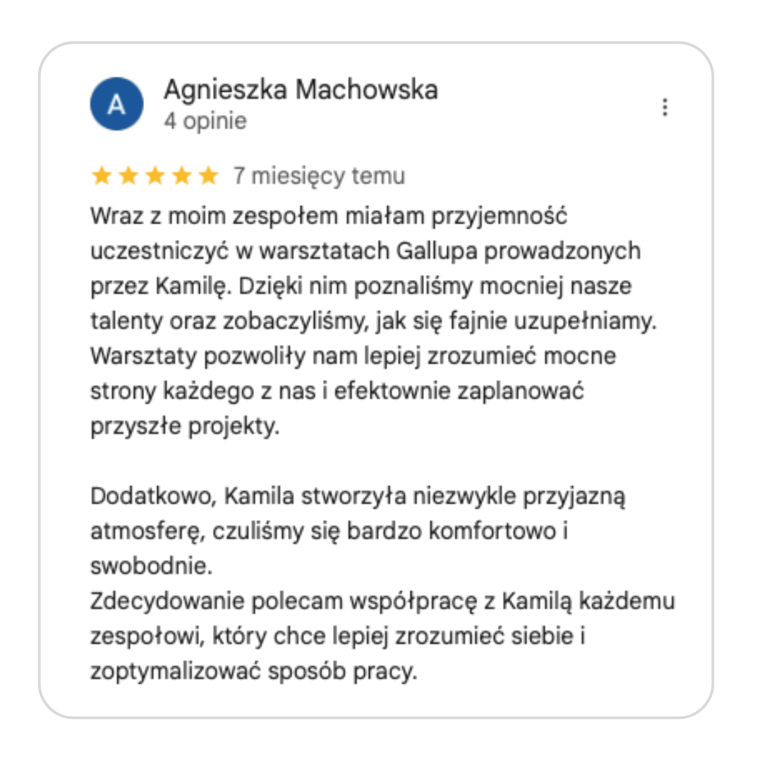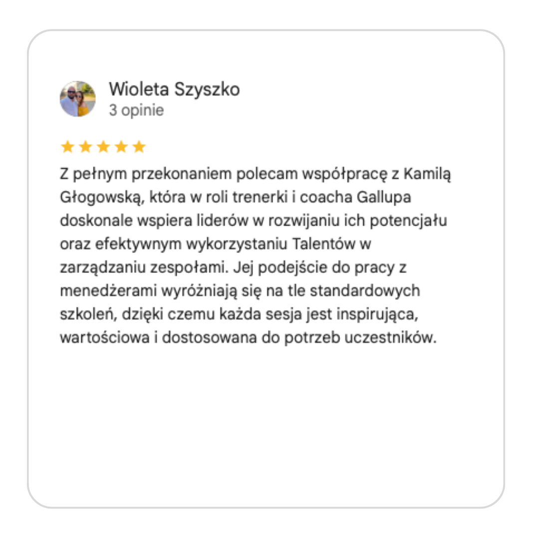 Nazywam się Kamila Głogowska i jestem Coachem Gallupa, HR-owcem i trenerem biznesu z praktyką dla takich firm jak Pluxee, Sodexo czy Hoop. Ja nie omawiam Talentów Gallupa, ja umacniam pojedyncze osoby, zespoły i firmy, aby nie marnować potencjału i być skutecznym w swoim stylu.