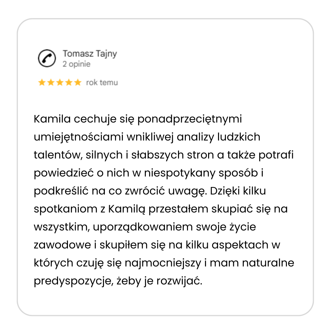 Sesja omawiająca Talenty to zdecydowanie najlepszy sposób na zrozumienie w jaki sposób tworzysz strategię, naturalnie działasz i budujesz relacje. To początek planowania realizacji Twoich celów , projektów i marzeń w zgodzie z Tobą. Dzięki nim uświadamiasz sobie kim już jesteś; jako członek zespołu, lider, właściciel firmy. Wzmacniasz pewność siebie oraz zauważasz swoją wyjątkowość.